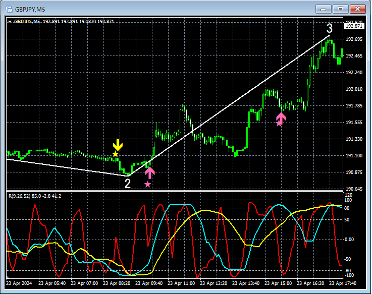 上の5分足では、エリオット波動の第3波の途中でmBDSR(RCI2本フィルター)の押し目買いサインが2回点灯して上昇している。
