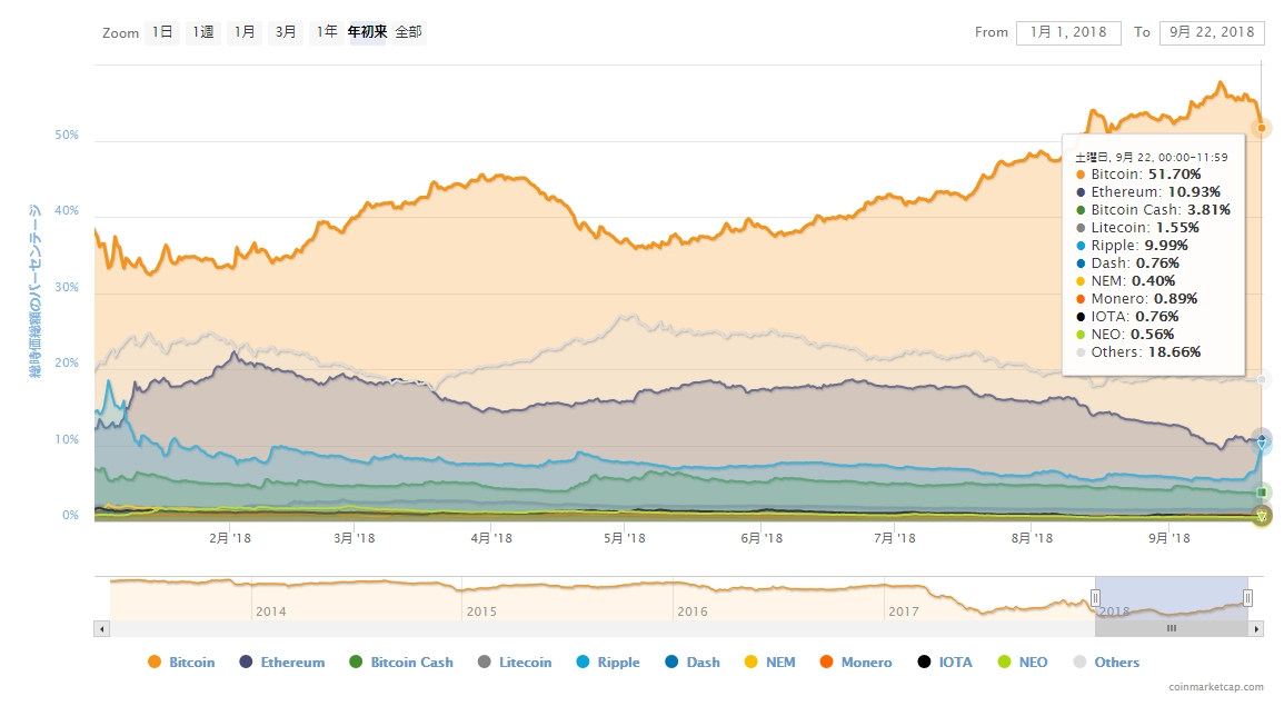 画像は2018年9月23日のキャプチャ。一昨日、昨日と強気の「緑」を続けていましたが、今日は調整のように反発し小幅下落する銘柄が目立ちます。そんな中、リップルは「緑」を継続して続伸しています。