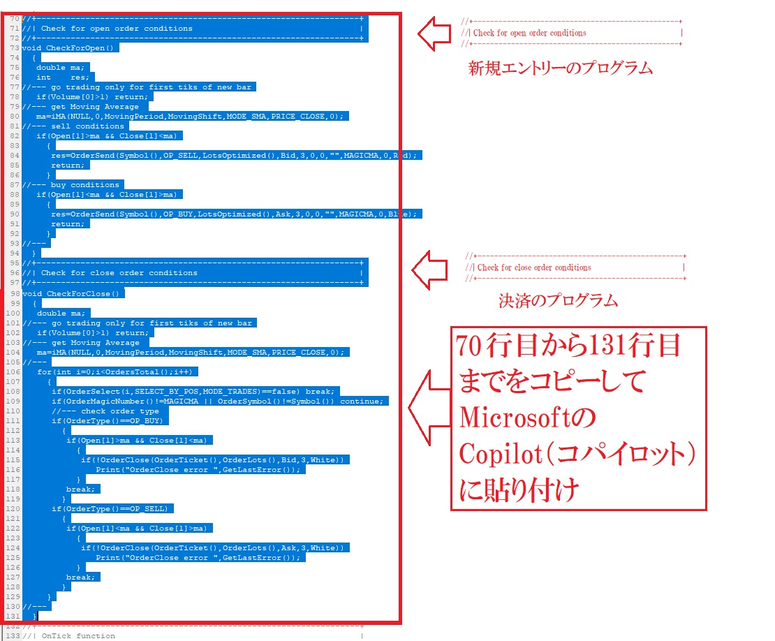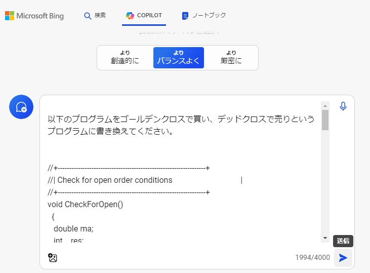 このEAのロジック部分をMicrosoftのCopilotを使ってカスタマイズして、ゴールデンクロスで買い、デッドクロスで売りというEAを作りたいと思います。