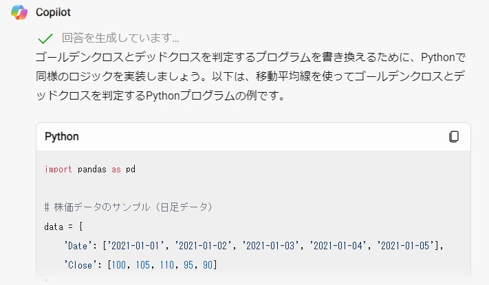 最初に、「以下のプログラムをゴールデンクロスで買い、デッドクロスで売りというプログラムに書き換えてください。」というプロンプトを送信してみました。
