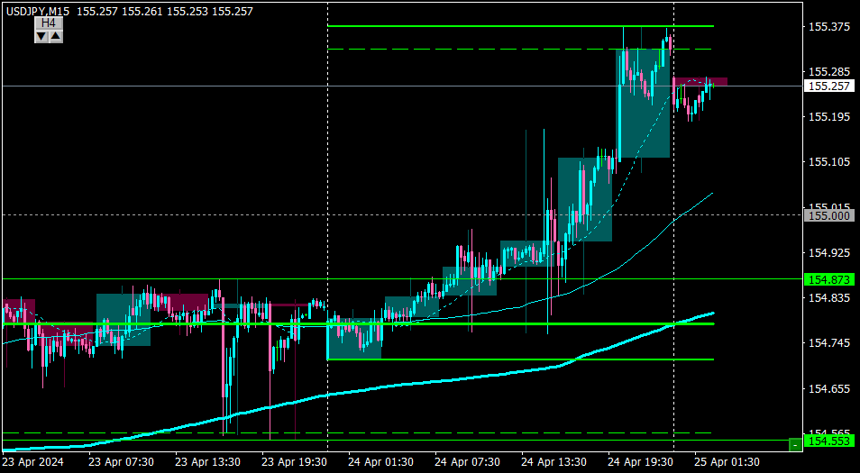 昨日は夜に155.0付近で欄黄河が発生し、トレンド転換のきっかけになるかと思ったがそのまま上昇。エントリーはせず。