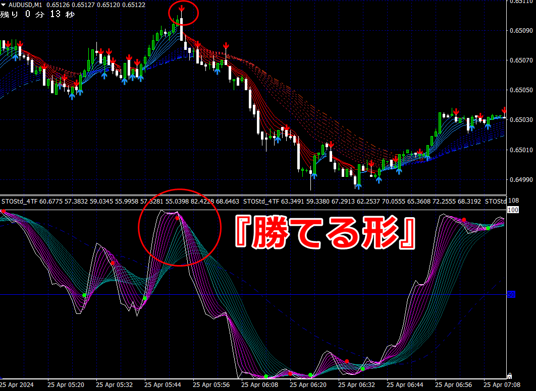 ② 矢印サイン点灯状態で、インジケーターのピンク色の帯が、緑の帯を下からすくい上げるような形状であれば、現在のローソク足が確定する数秒前か確定の直後に1分判定または3分判定でハイエントリーします。