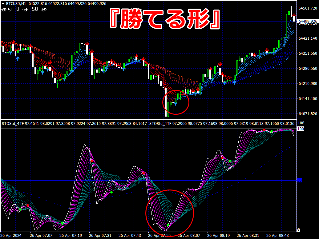 ② 矢印サイン点灯状態で、インジケーターのピンク色の帯が、緑の帯を下からすくい上げるような形状であれば、現在のローソク足が確定する数秒前か確定の直後に1分判定または3分判定でハイエントリーします。