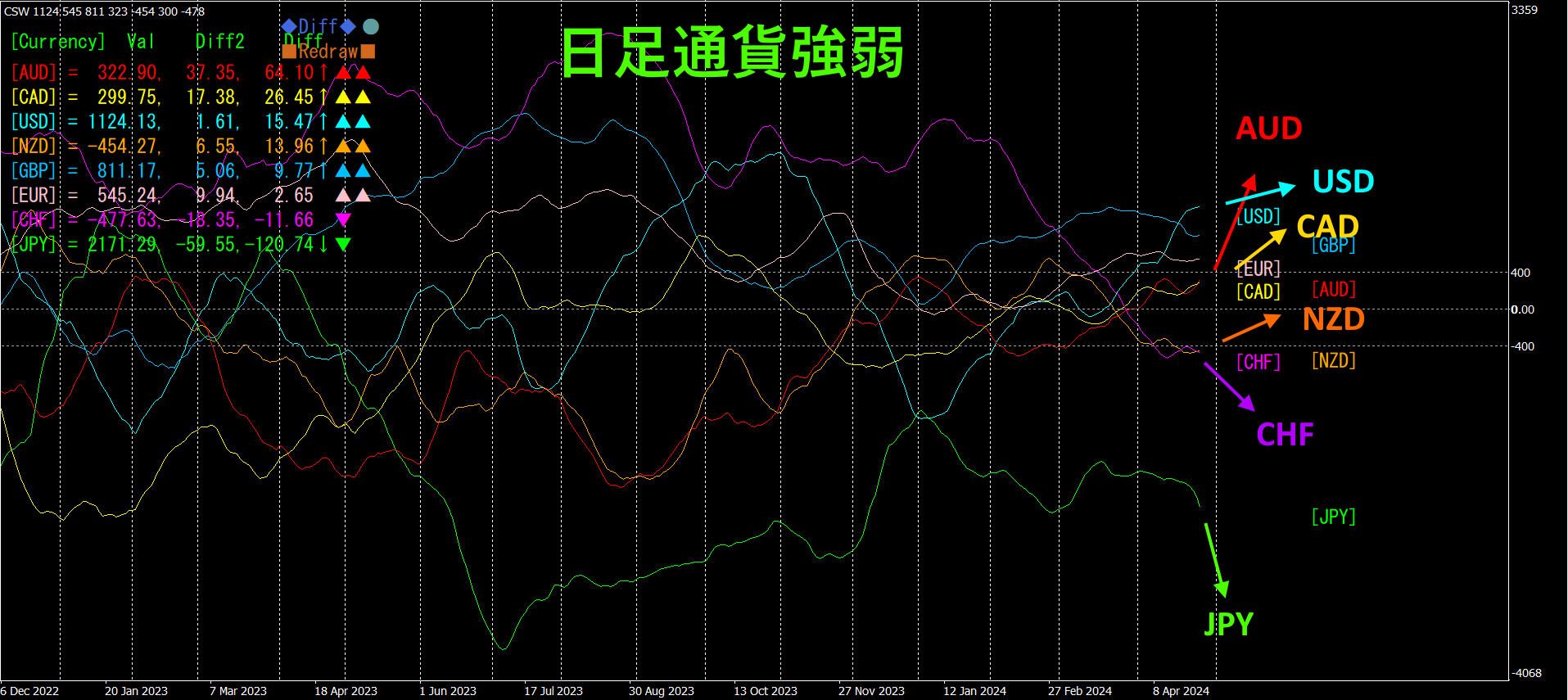 AUD、CAD、USD、NZDが上向きです。一方、JPY、CHFが下向きになっています。日足チャートではAUDの上昇とJPYの下落が著しいです。特にJPYの下落が目立っています。