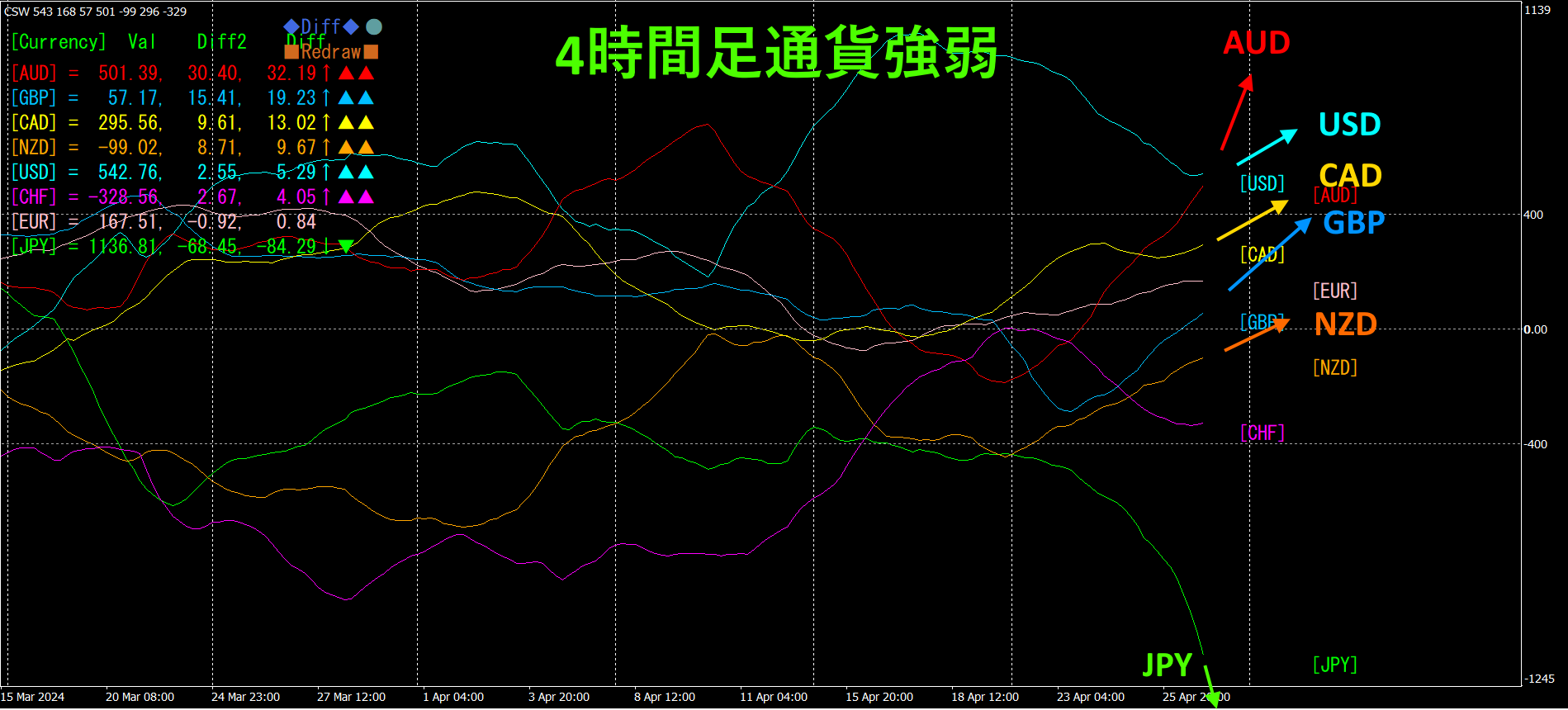 4時間足では、AUD、GBP、CAD、NZD、USDが上昇しています。一方、JPYが下向きになっています。