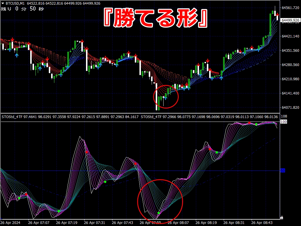 ② 矢印サイン点灯状態で、インジケーターのピンク色の帯が、緑の帯を下からすくい上げるような形状であれば、現在のローソク足が確定する数秒前か確定の直後に1分判定または3分判定でハイエントリーします。