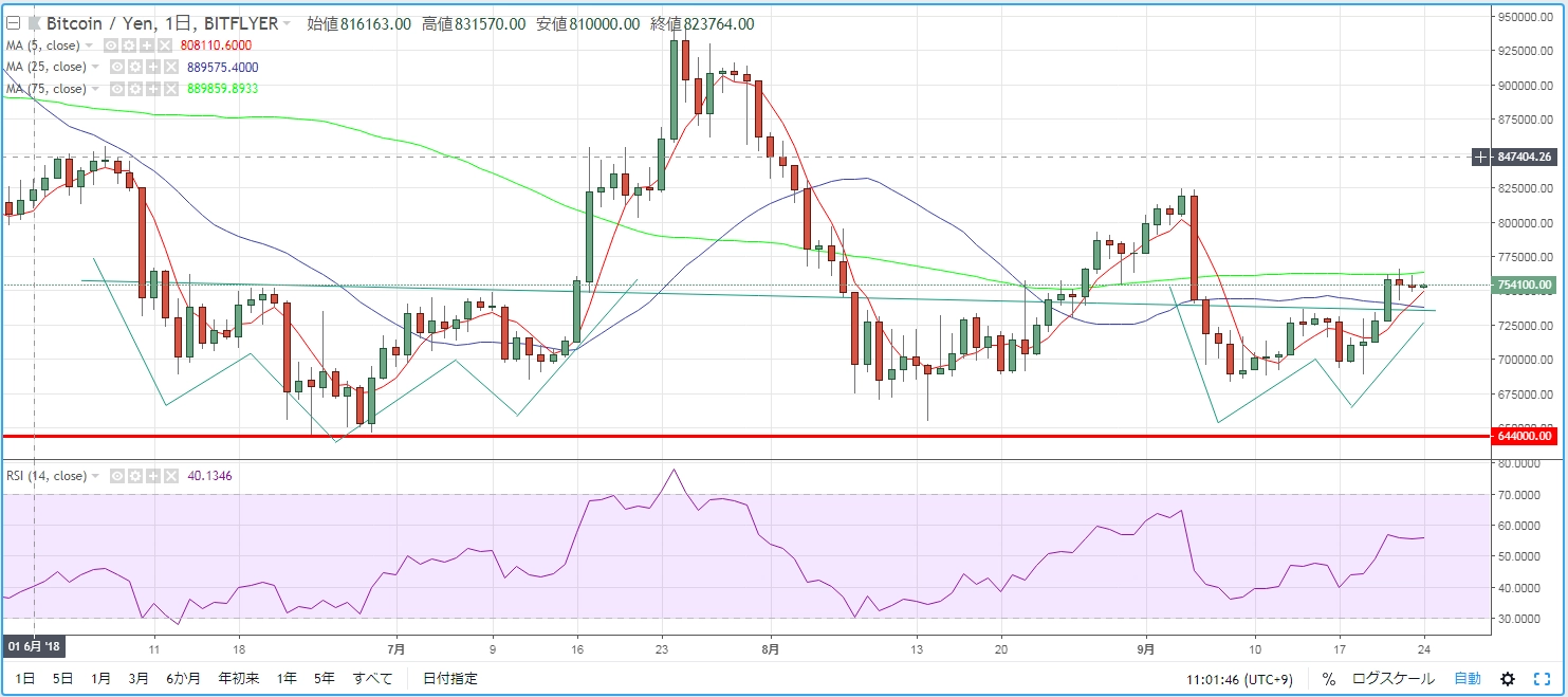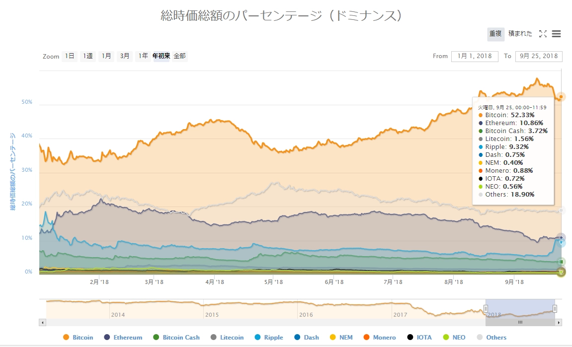画像は2018年9月245日のキャプチャ。全体的に強気を示しことが数日続いていましたが、「真紅」を交えた暴落を迎えています。特にここ最近で上昇したリップルは、16%超の下落となっています。ただ、ビットコインは若干の下落に踏みとどまっています。
