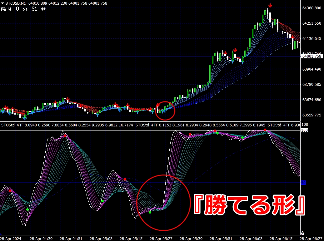 ② 矢印サイン点灯状態で、インジケーターのピンク色の帯が、緑の帯を下からすくい上げるような形状であれば、現在のローソク足が確定する数秒前か確定の直後に1分判定または3分判定でハイエントリーします。