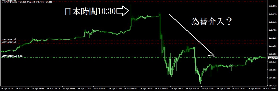 4月29日 午前10:30頃、ドル円が一時160円台に突入!その後は急激に円高方向へ動き、154円50銭まで円が買われる展開に。