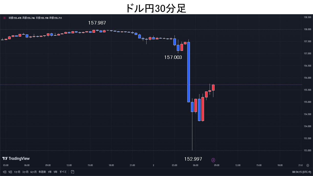 パウエルFRB議長は記者会見で「インフレは依然として高すぎる」「利下げの確信を得るには想定より時間がかかる見通し」と発言。また、「次の行動が利上げになる可能性は低い」と利上げの可能性を否定。米10年債利回りの低下とともに、ドル円は157.00円まで下落。5時過ぎに、断続的に円買い・ドル売りのフローが観測されると、政府・日銀による円買い介入との観測が高まり、ドル円は一時152.99円まで急落。
