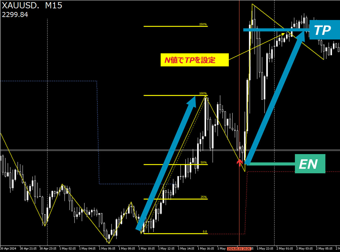 N値でTPを設定する方法です。下記の例の場合、約50%まで押し目をつけているので、N値は50%+100%=150%の位置となります。