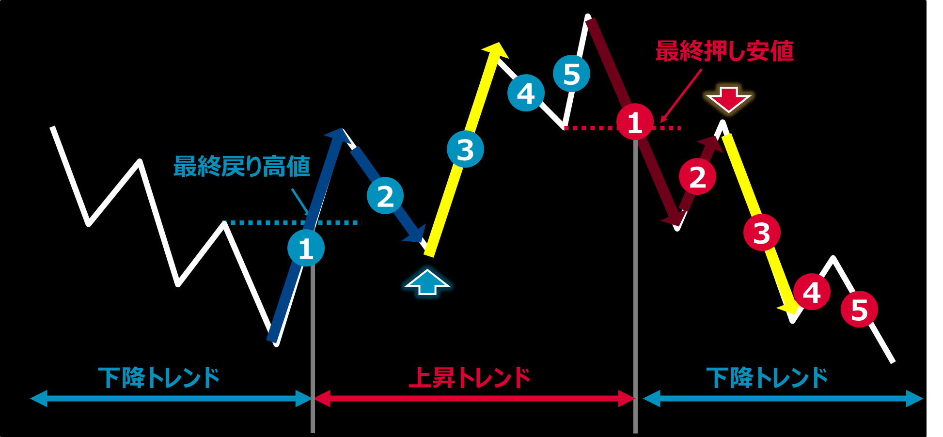 本ツールはダウ理論のトレンド転換後の、エリオット波動3波の箇所でサインが通知されます。これを踏まえた上で、損切り/利確戦略について紹介いたします。