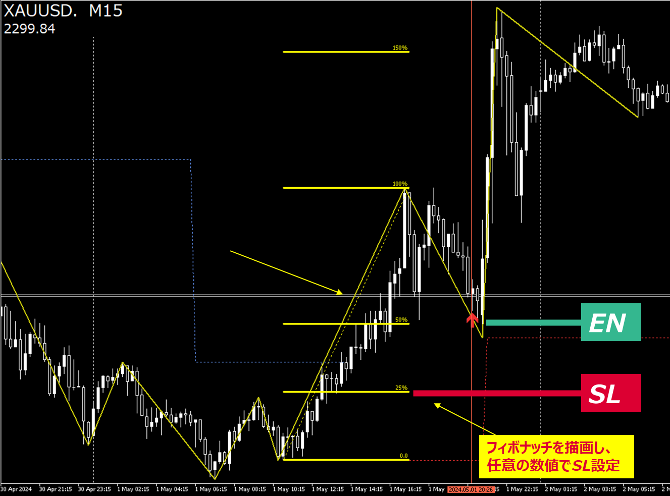 トレンド転換の起点からフィボナッチを描画し、任意の数値でSL設定する方法です。