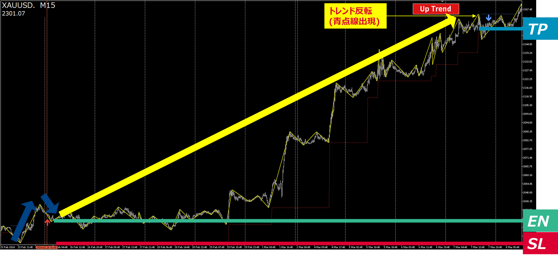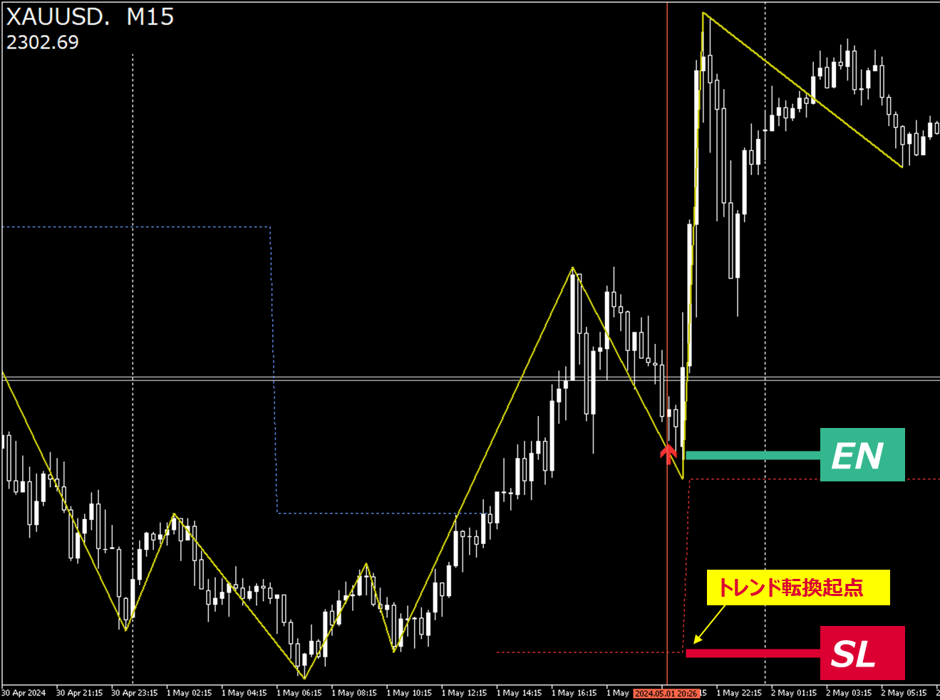 下記の例のように、トレンド転換起点をSLとする方法です。