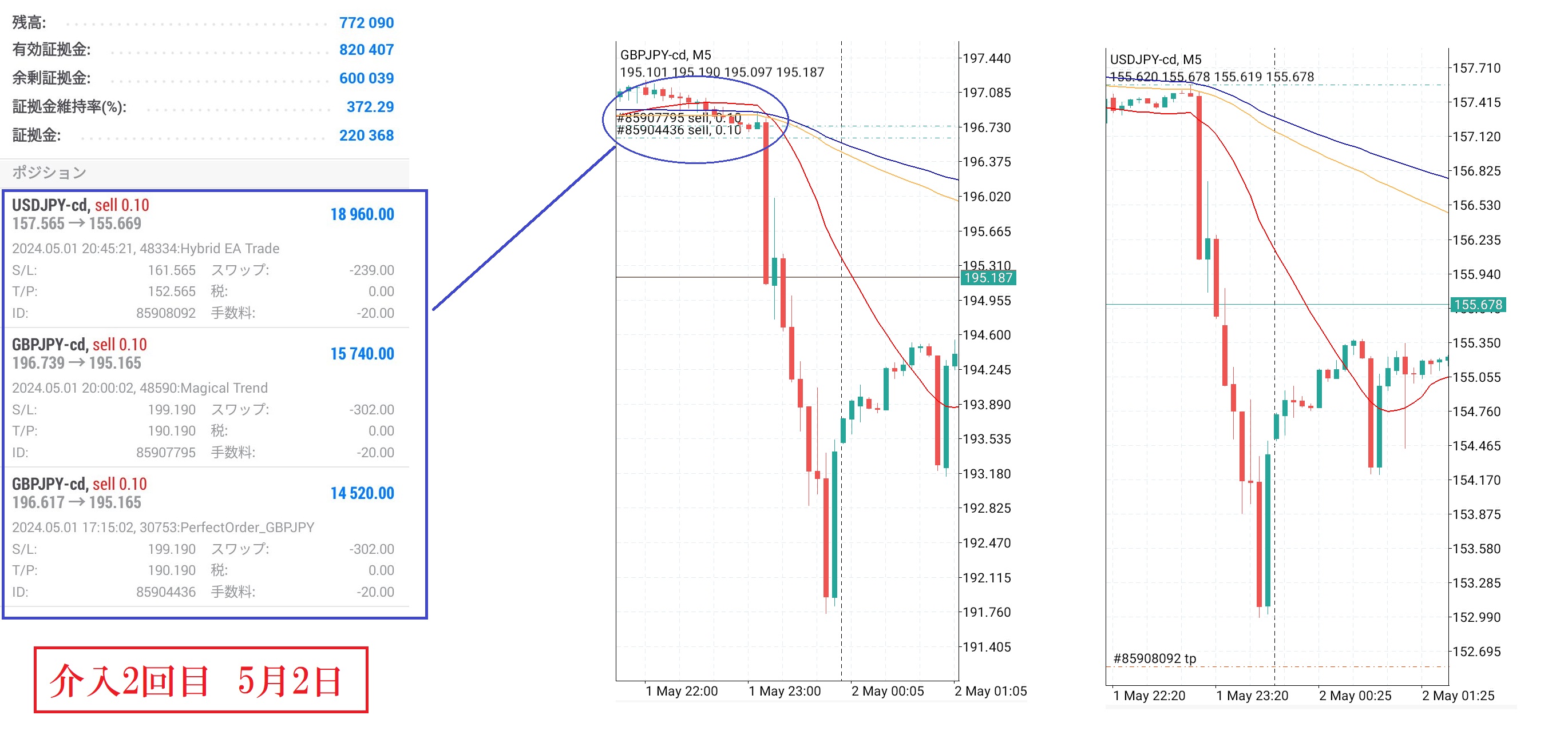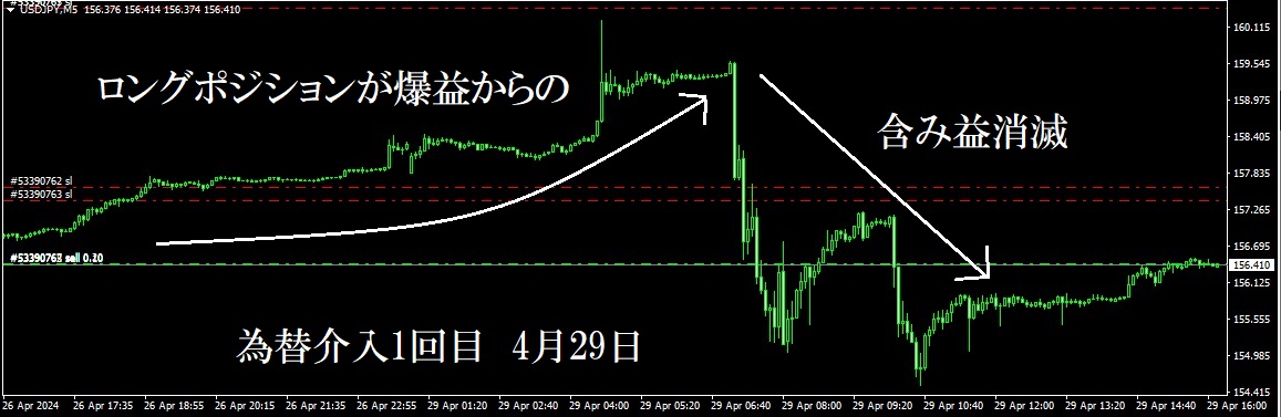 わたしの順張り型のEAはというと、最初の介入ではロングのポジションが根こそぎやられ、利益の大半を吹き飛ばす結果に・・・。