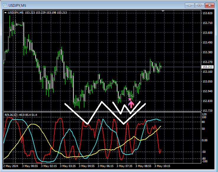 ドル円 ダブルボトムの右側の谷で形成されたもう一つのダブルボトムとmBDSR(RCI2本フィルター)の押し目買いサイン