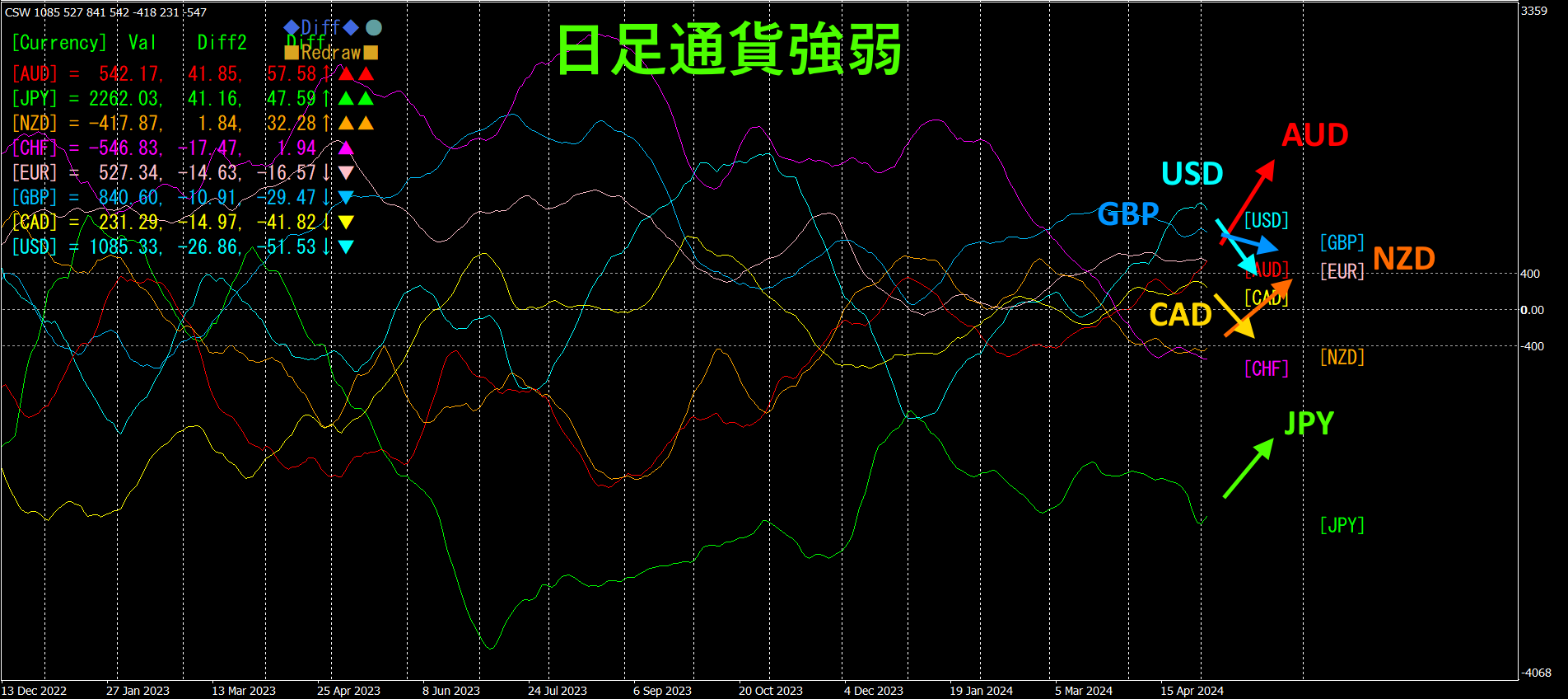 AUD、JPY、NZDが上向きです。一方、USD、CAD、GBPが下向きになっています。日足チャートではAUDの上昇とUSDの下落が著しいです。JPYは為替介入の影響で上を向きましたが、相対的位置は、最も下になっています。