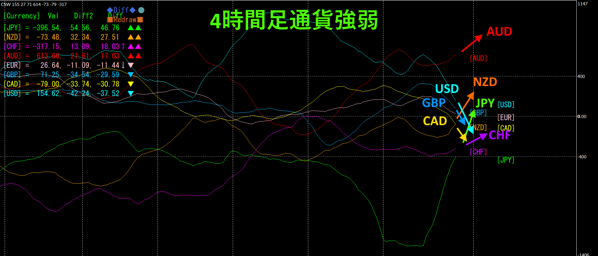 4時間足では、JPY、NZD、AUD、CHFが上昇しています。一方、USD、CAD、GBPが下向きになっています。