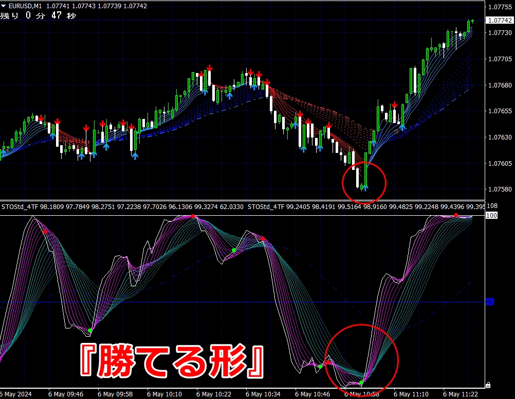 ② 矢印サイン点灯状態で、インジケーターのピンク色の帯が、緑の帯を下からすくい上げるような形状であれば、現在のローソク足が確定する数秒前か確定の直後に1分判定または3分判定でハイエントリーします。