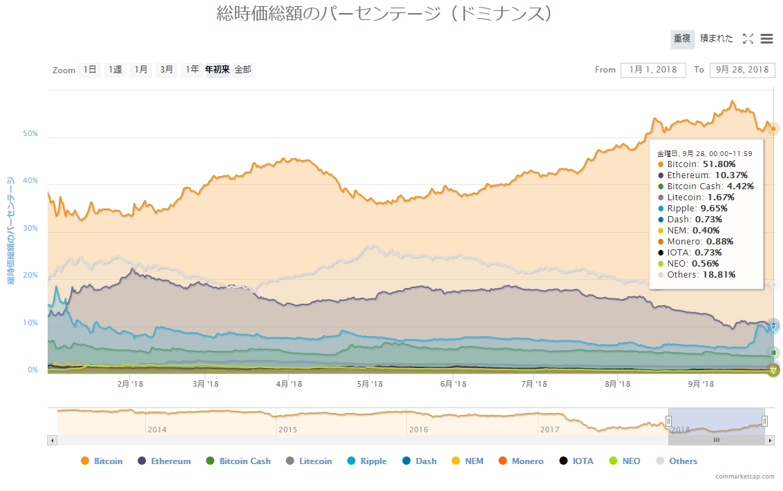 画像は2018年9月28日のキャプチャ。下げの占める割合が多い日が続いていましたが、今日は「緑」の目立つ上昇の相場環境となっています。ビットコインキャッシュ、イーサリアム、ライトコインが目立った回復を見せています。