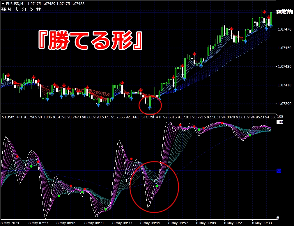 ② 矢印サイン点灯状態で、インジケーターのピンク色の帯が、緑の帯を下からすくい上げるような形状であれば、現在のローソク足が確定する数秒前か確定の直後に1分判定または3分判定でハイエントリーします。