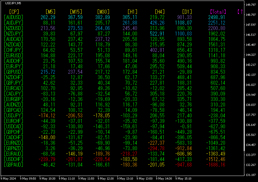 [Total]数値の降順に並んでいます。一番上の行にあるAUDUSDは、全ての時間足で青色になっています。しかもTotal数値が 2498.91と大きなプラスの数字になっています。AUDUSDに上昇トレンドが発生していることを示しています。