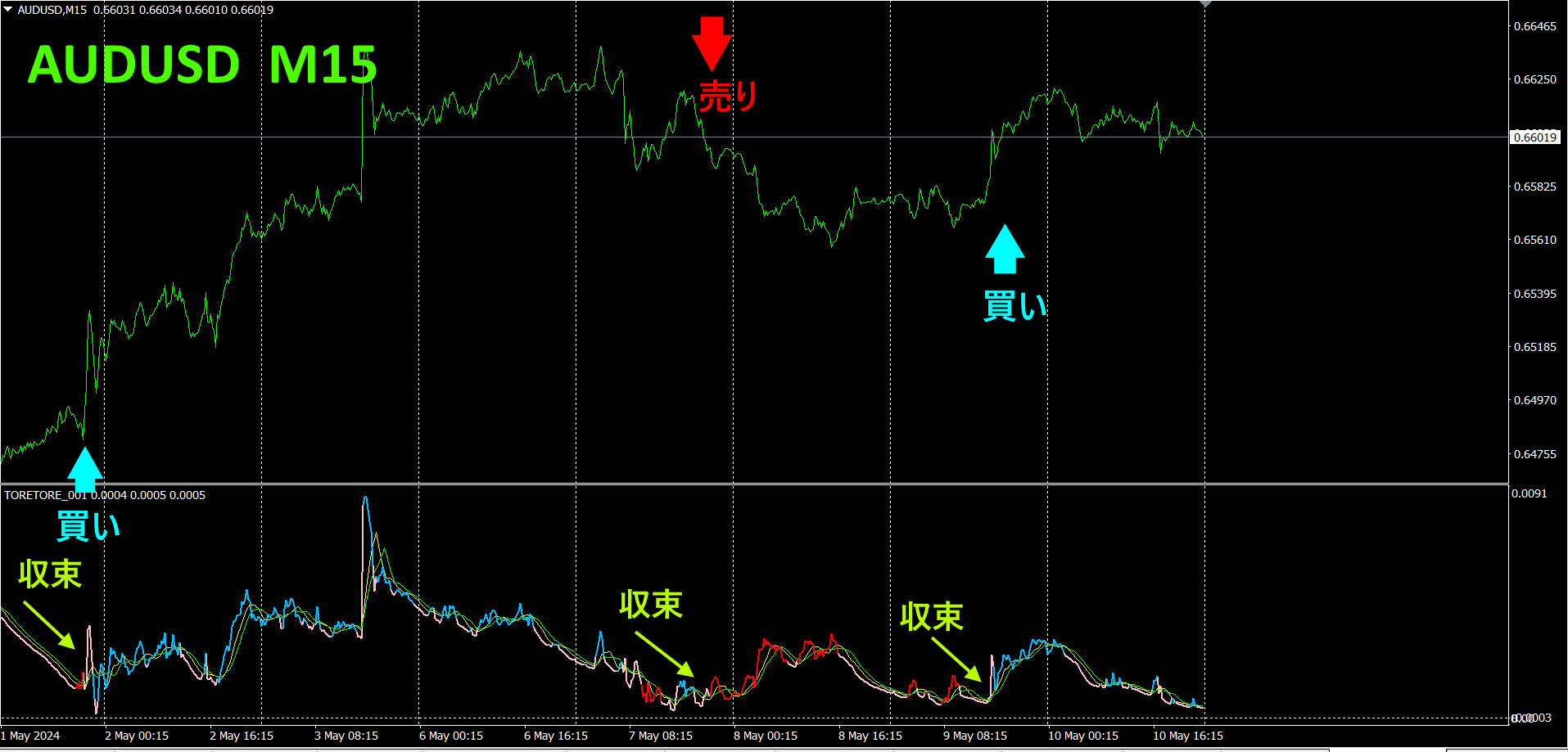 AUDUSDの15分足に「とれとれインジケータ」を導入します。インジケータのメイン線が、十分に収束するのを待ってから、トレードを開始します。