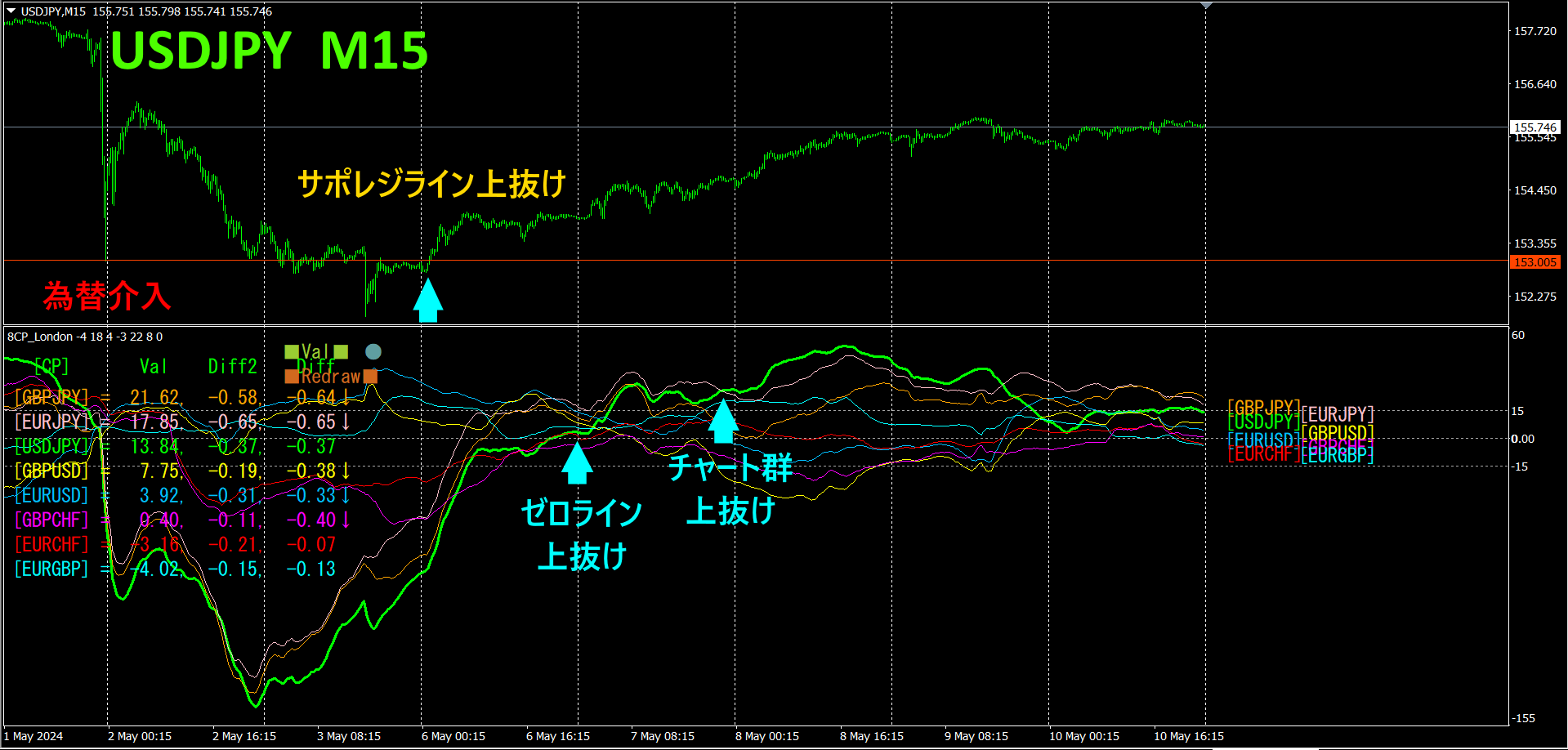 上半分は、USDJPYの15分足チャートです。下半分は、「8CP見える化インジケータ」によるものです、緑色太線のグラフがUSDJPY に相当します。