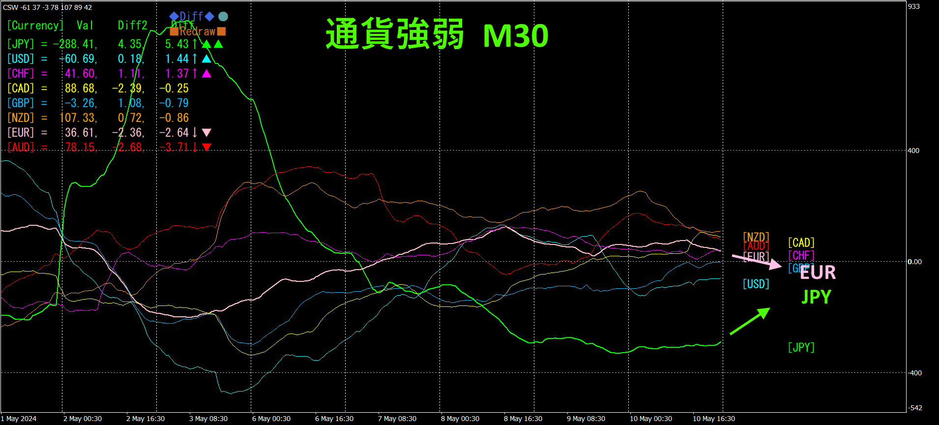 ピンク色がEUR、緑色がJPYです。為替介入の影響で、JPYは一時的に最も強い通貨になりましたが、この状態がいつまでも続くはずもなく、下落して、元々の最も弱い通貨に戻っています。その後JPYは、やや上向きになり、EURはやや下向きになっているので、今後のEURJPYは、頭打ちとなり、少し下方向に向かうと考えられます。