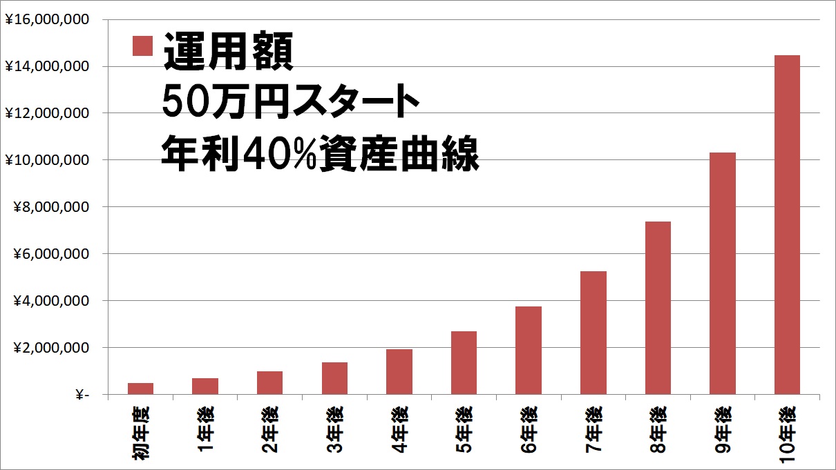 年利約40%なので、例えばこのEAを50万円で運用すると4年後には約400万円、9年後には1000万円になります。