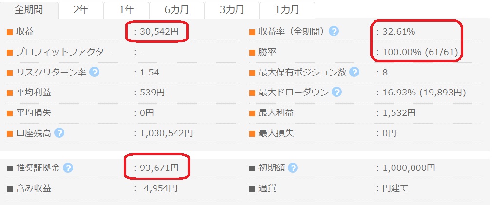 約10万円の証拠金で3ヶ月運用した結果、3万円の利益を得ることが出来ました。四半期で30%の利益です。