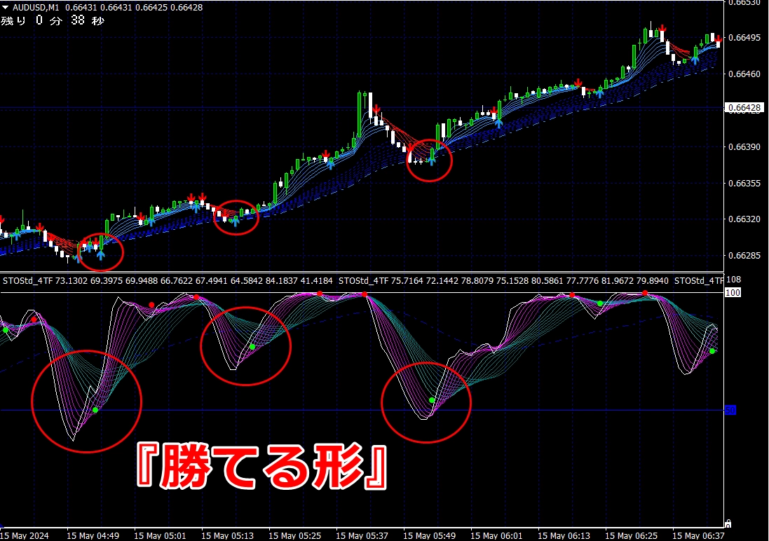 ② 矢印サイン点灯状態で、インジケーターのピンク色の帯が、緑の帯を下からすくい上げるような形状であれば、現在のローソク足が確定する数秒前か確定の直後に1分判定または3分判定でハイエントリーします。