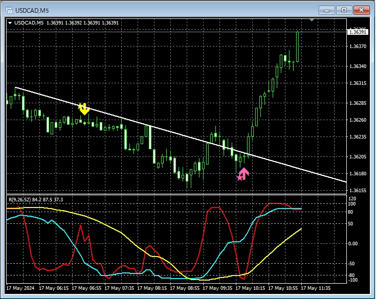 上の5分足では酒田五法の「明けの明星」(に近い形)が出現した後、mBDSR(フィルター:RCI26とRCI52)の押し目買いサインが点灯して上昇している。