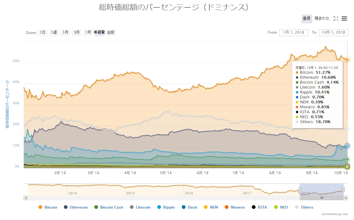 画像は2018年10月01日のキャプチャ。「緑」が目立った昨日の流れでしたが、今日は「緑」「赤」が入り交じった相場環境となっています。注目はリップルで、好調をキープしています。