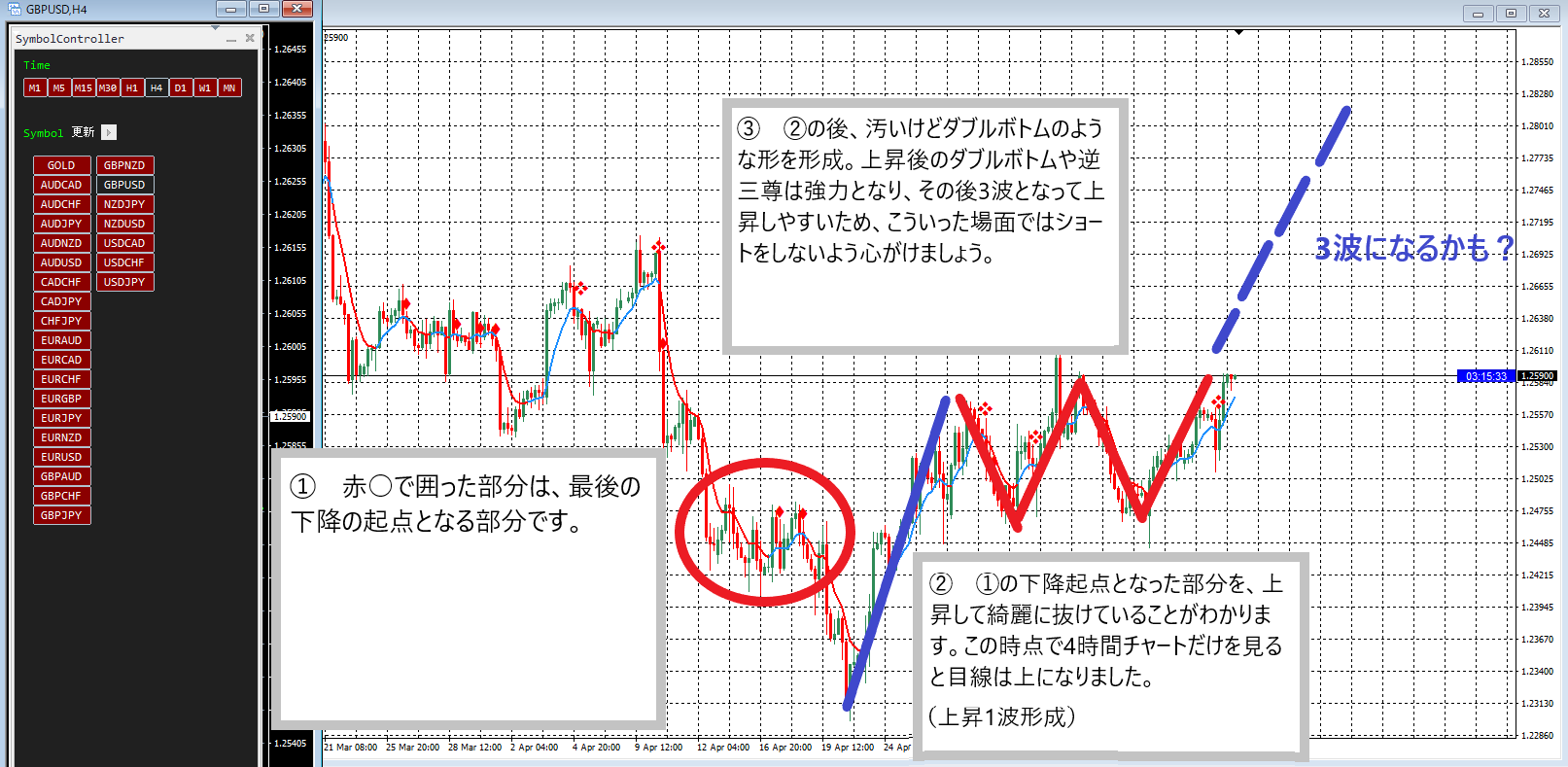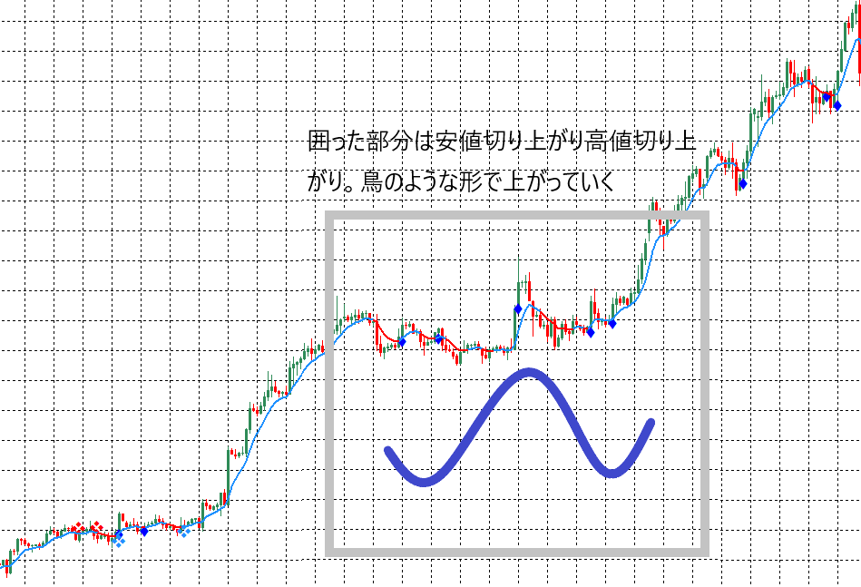 その後のチャートも追ってみましたが、やはり上昇3波となりましたので、目線が切り替わったときはサイン通りにはエントリーせず、スルーもしくはいつも紹介している「上昇後のダルブルボトム」となりますので、サインを無視して上昇3波を狙っても良いかと思います。