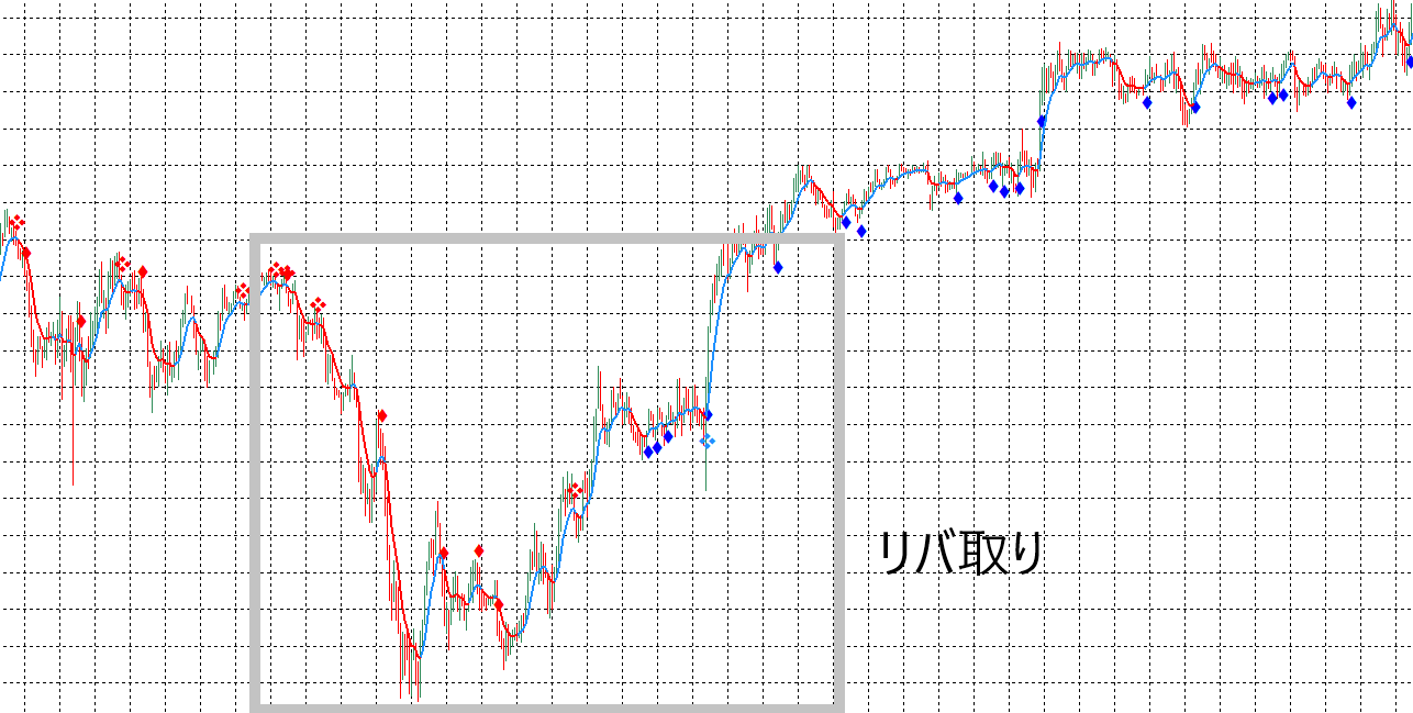上記チャートは、ずっと下降のサインが出現していますが、○で囲った部分はショートサインが出現しているものの、跳ね返されて上昇しています。