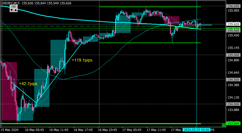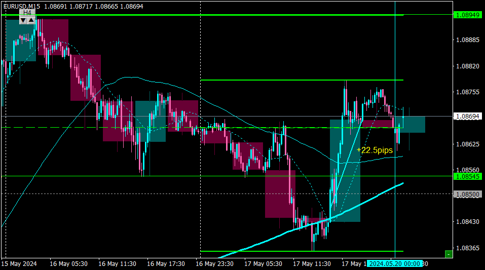先週の金曜は、朝のシナリオ通り、H4MAで反発したタイミングでロング。22時の足のクローズでイグジット。+22.5pips