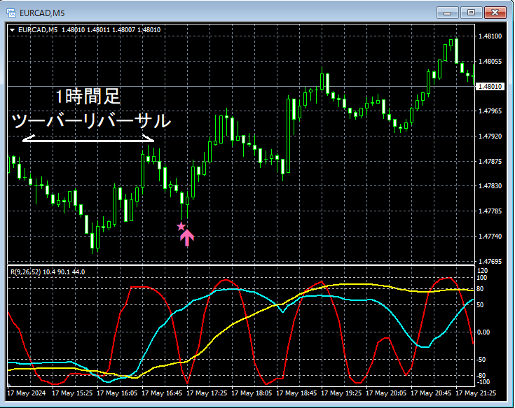 上の1時間足で白い円で囲ったあたりを見ると上昇を示唆するツーバーリバーサルが出現していることが分かる。下位足で押し目買いを考えてもおかしくない場面かもしれない。