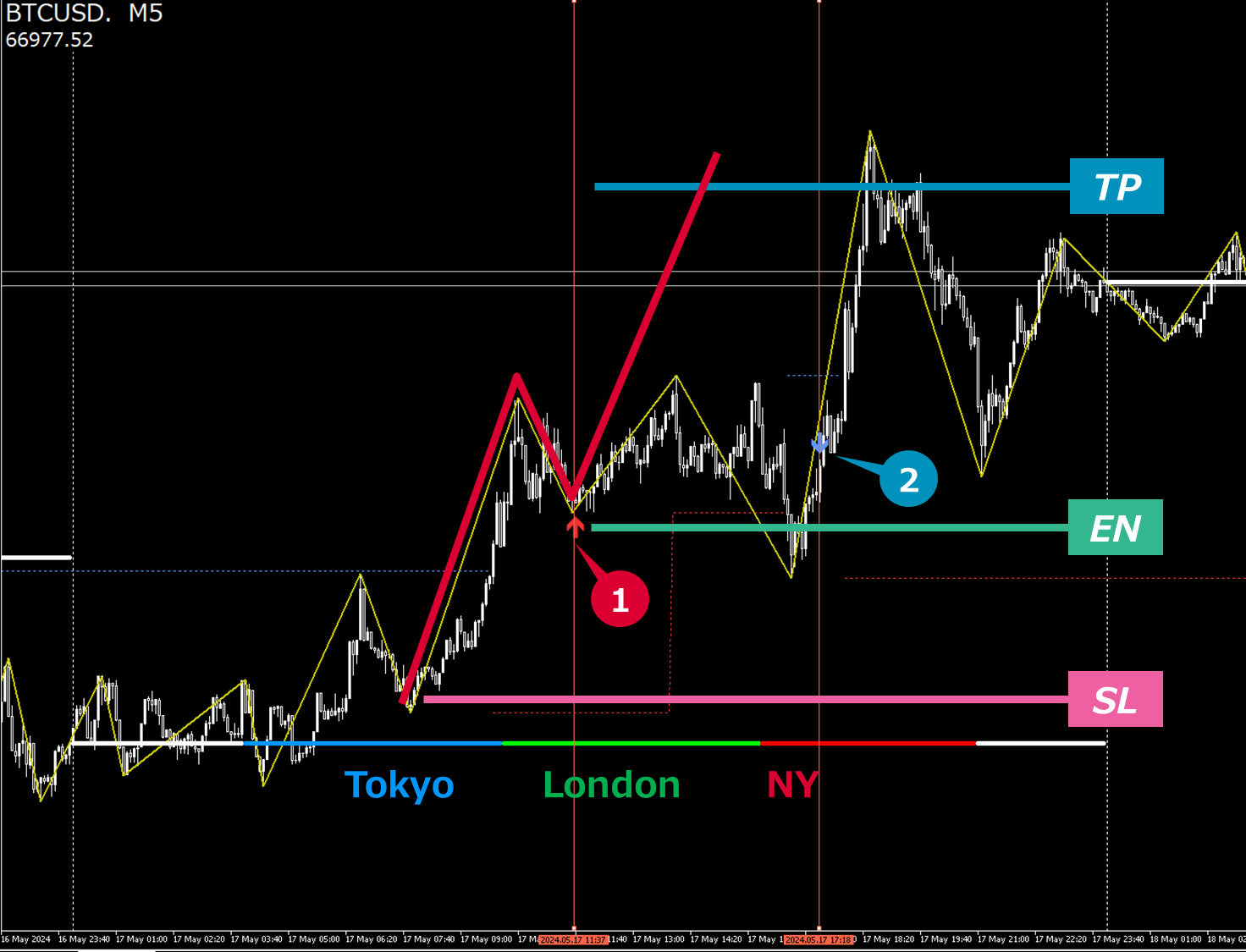 サイン①:ロンドン時間のロングアラートでした。BTCは買い戦略ですのでN値狙いで利確できたトレードでした。