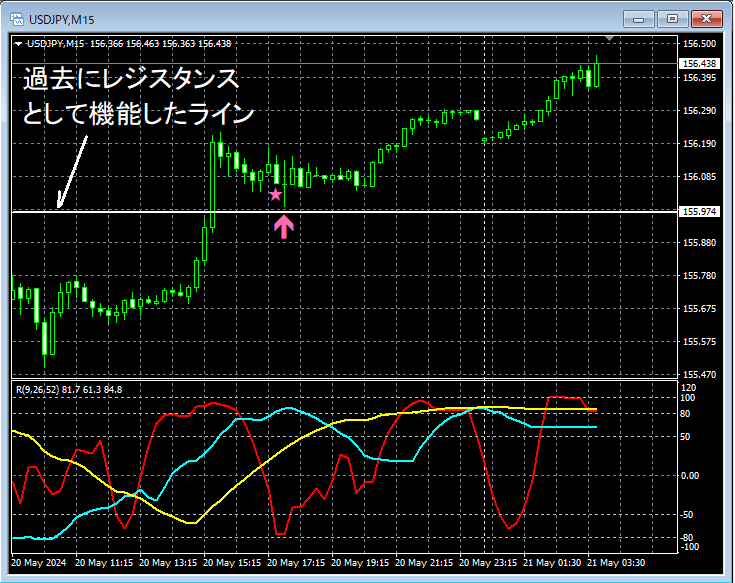 この例から、3回目の高値トライやレジサポ転換に注目したトレード手法とmBDSRのサインとの親和性の高さがうかがえる。