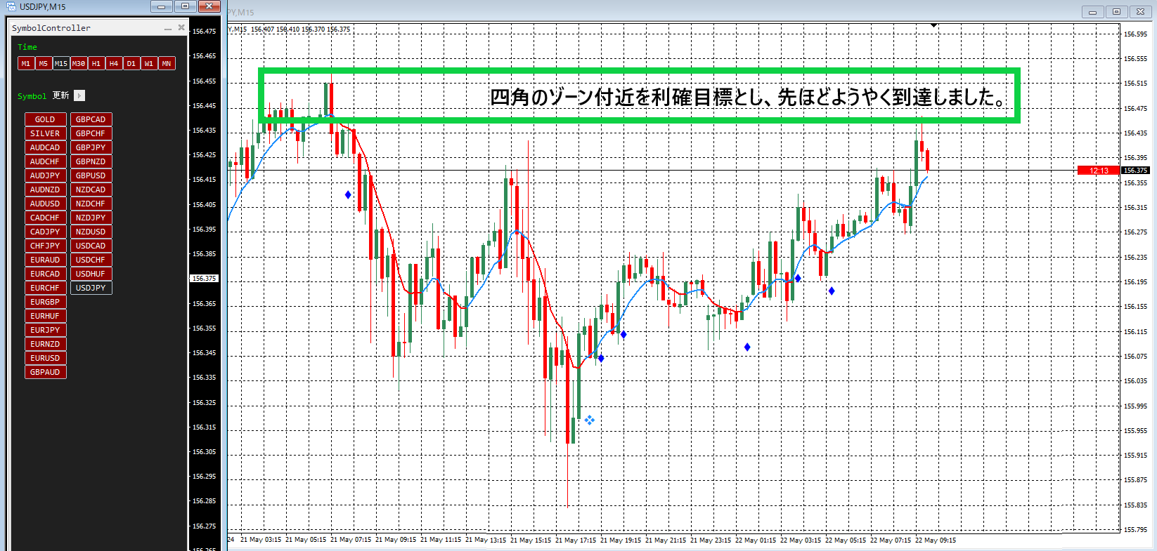 目標のポイントは直近高値付近をゾーンとして、156.500付近までです。