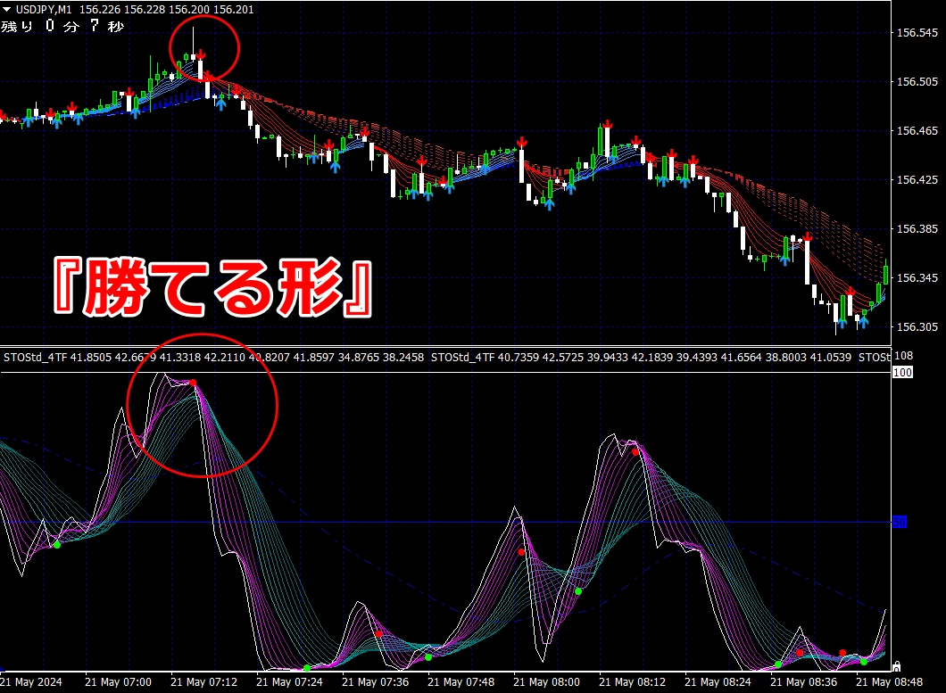 ② 矢印サイン点灯状態で、インジケーターのピンク色の帯が、緑の帯に上から覆いかぶさるような形状であれば、現在のローソク足が確定する数秒前か確定の直後に1分判定または3分判定でローエントリーします。