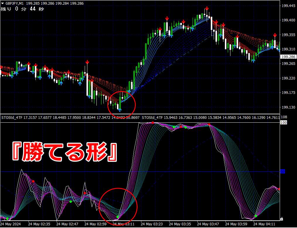 ★ サイン点灯後、ピンク帯が緑帯をすくい上げる形状で必勝エントリー!