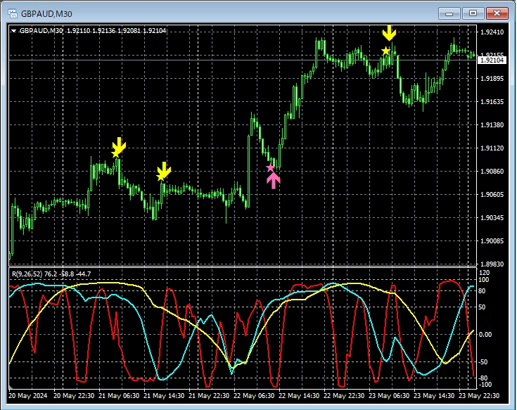 上の4時間足を見るとカウンタートレンドライン上抜け後の下げでmBDSR(RCI2本フィルター)の押し目買いサインが点灯し上昇している。第3波の初動をとらえている。