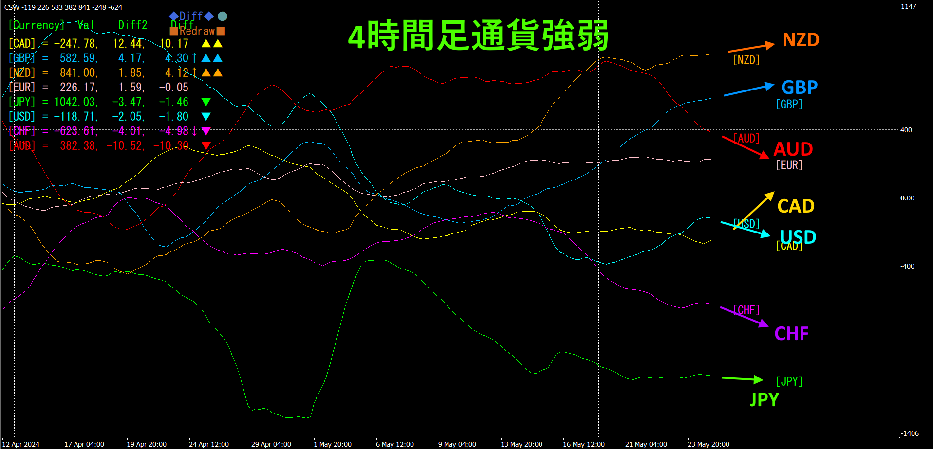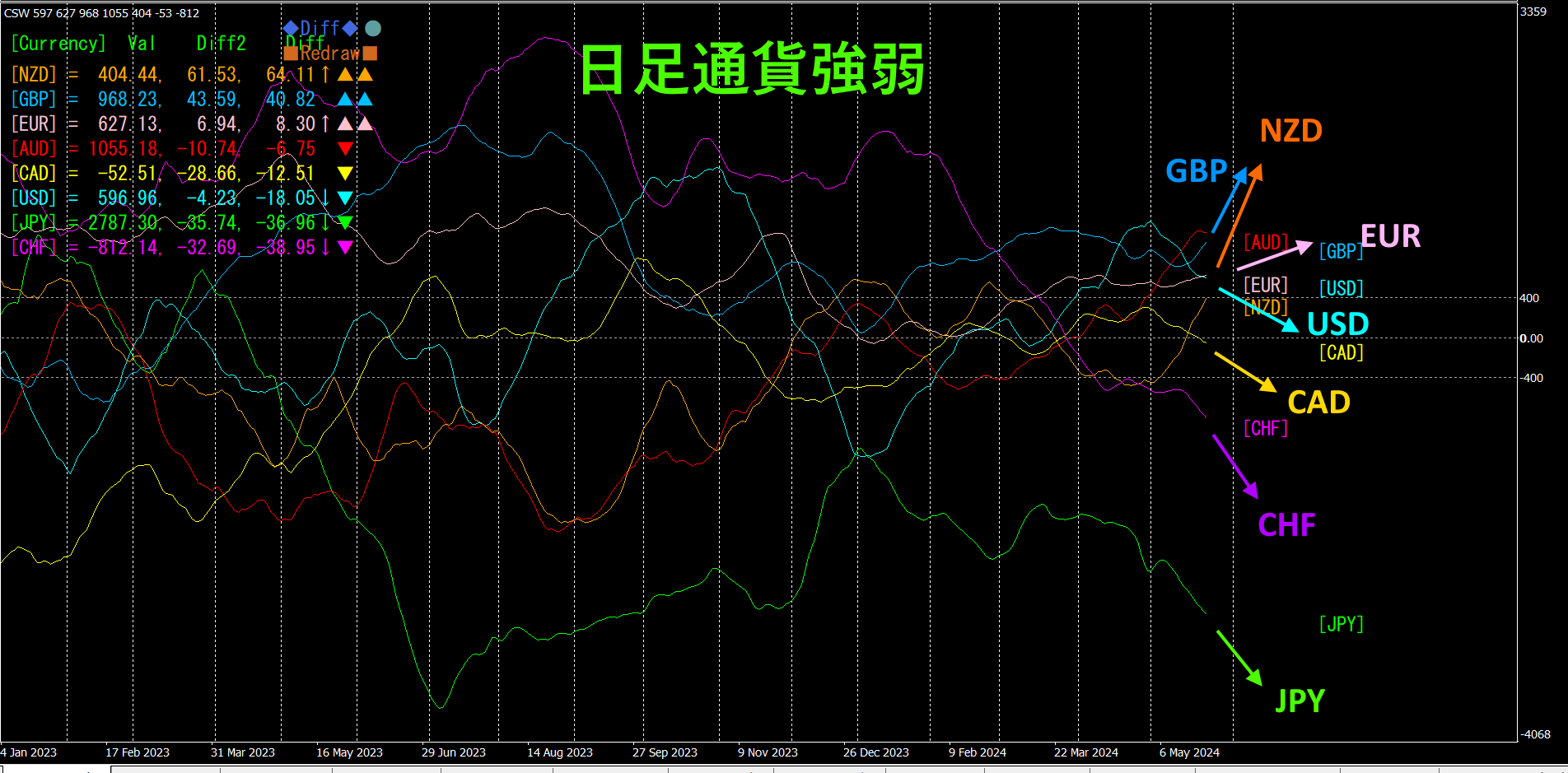 NZD、GBP、EURが上向きです。一方、CHF、JPY、USD、CADが下向きになっています。日足通貨強弱チャートではNZDの上昇が目立っています。CHFは弱くなっています。JPYは最も弱い通貨で、下降中です。
