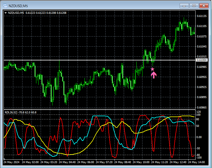 上の5分足では、レジスタンスとして機能していたラインを上抜けした後の下げでmBDSR(RCI2本フィルター)の押し目買いサインが点灯して、その後、プライスは順調に上昇している。