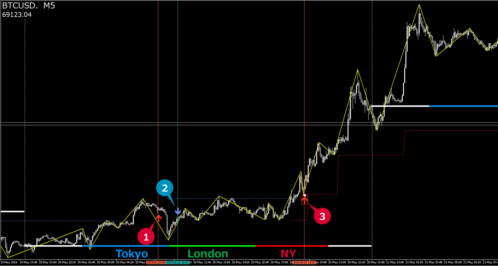 サイン③:NY時間、ロング通知となりました。これは大きく伸びましたね!BTCは買いでしっかり伸ばすことで利益を確保できる通貨という印象です。