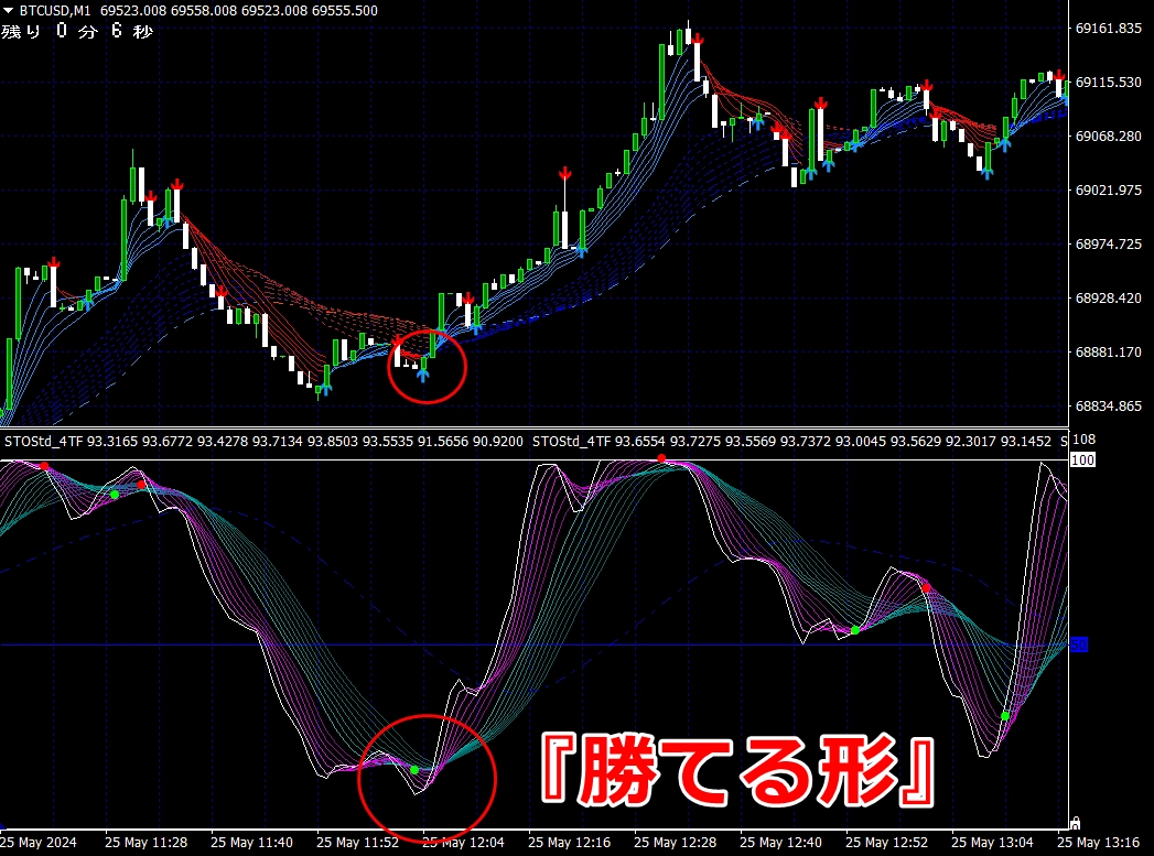 ② 矢印サイン点灯状態で、インジケーターのピンク色の帯が、緑の帯を下からすくい上げるような形状であれば、現在のローソク足が確定する数秒前か確定の直後に1分判定または3分判定でハイエントリーします。