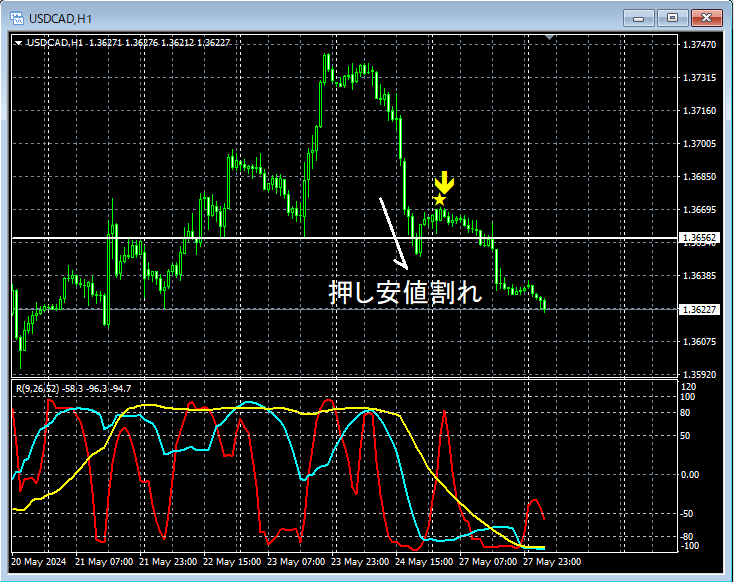 上の1時間足では、押し安値を下抜けした後の上昇でmBDSR(フィルター:RCI26とRCI52)の戻り売りサインが点灯し、その後、プライスは順調に下げている。