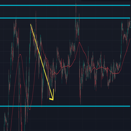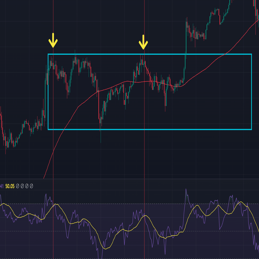 レンジの上限でRSIが70を上回ったところでエントリーみたいな方法です。